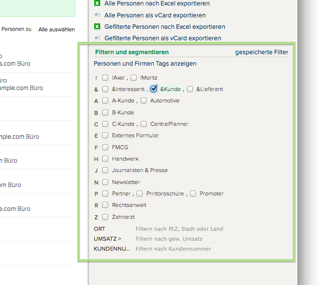 Übrigens: Um häufig genutzte Tags schneller zu finden oder zu Kategorien zusammenzufassen, können Sie Sonderzeichen wie '@' oder '#' nutzen. In der Abbildung haben wir zum Beispiel die Kontaktarten Kunde, Lieferant, Promoter und Sonstige mit dem '§' gruppiert. So bleibt zusammen was zusammen gehört.