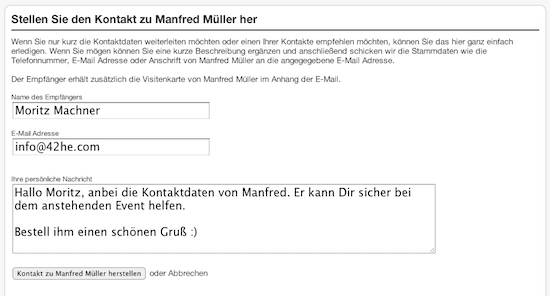 Wie in dem Beispiel klicken Sie auf der Seite Ihres Kontaktes auf den Link in der rechten Spalte, in diesem Fall “Manfred Müller weiterempfehlen”. Anschließend können Sie den Namen und die E-Mail Adresse des Empfängers angeben und wenn Sie mögen eine kurze persönliche Nachricht dazu schreiben.