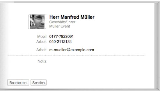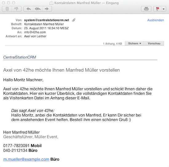 Die Stammdaten fassen wir außerdem in einer Visitenkarten Datei zusammen, so dass der Empfänger alles mit einem Klick in sein Outlook oder ein sonstiges E-Mail oder CRM Programm übernehmen kann.