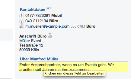 In der Arbeit mit seinen Kontakten gibt es Felder, die man regelmäßiger ändert als andere. Gerade für den Poweruser der von Morgens bis Abends in seinem CRM arbeitet, gilt es hier die Klickwege zu minimieren und die gewünschten Funktionen noch leichter erreichbar zu machen. Bei uns sind das in erster Linie Hintergrundinformationen zu Personen und Firmen sowie Angeboten und Projekten. In den individuellen Feldern speichern Sie ebenfalls unterschiedliche Informationen, die teilweise regelmäßig bearbeitet werden.