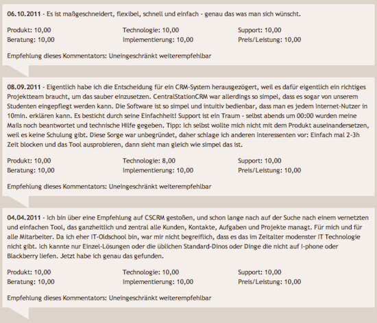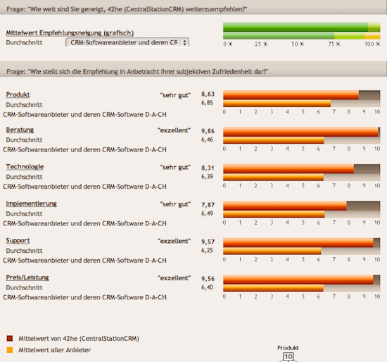 Benchpark bewertet CRM Anbieter anhand der sechs Kriterien Produkt, Beratung, Technologie, Implementierung, Support und Preis/Leistung. Bei dem Blick auf die Zahlen in jedem einzelnen Bereich können wir uns das Schmunzeln nicht verkneifen. Es gibt kaum eine größere Wertschätzung unserer Arbeit. Aber sehen Sie selbst - die Zahlen sind brandaktuell von heute morgen.