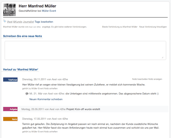 Neben dem Dateien haben wir die Verlaufsansichten von Personen, Firmen, Angeboten und Projekten aufgeräumt und noch einmal deutlich verschlankt. Indem wir den Verfasser und den Zeitpunkt der Erstellung an den Anfang der Nachricht setzen (vorher befanden sich diese Informationen in der rechten Spalte), gewinnen wir die vollständige Breite für den Inhalt der Notiz. Das hilft insbesondere bei der Nutzung unserer CRM Software auf kleineren Laptops oder Tablet Computern, wie dem iPad. Neu hinzu gekommen sind Kommentare zu einer Notiz, sofern diese vorhanden sind.