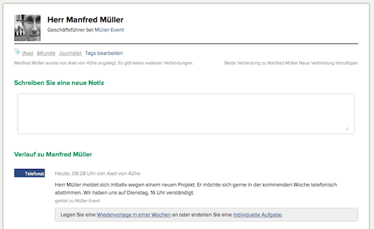 Ein allzu gut bekanntes Szenario: Man hat mit seinem Kunden gesprochen, schreibt eine kurze Notiz dazu und weiter gehts mit dem nächsten Kontakt. Aber Moment - wie geht es denn jetzt mit dem ersten Kontakt weiter? Um den nächsten Schritt und möglicherweise den Projektzuschlag nicht zu verpassen legt man sich meist eine Wiedervorlage, ein “Follow Up” oder einen Rückruf an.
