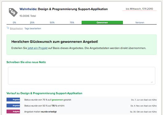 Ein weiterer Workflow, den Sie seit gestern Abend in Ihrem CRM finden, ist die Erstellung von Projekten auf Basis von Angeboten. Sobald Sie ein Angebot als gewonnen markieren schlagen wir Ihnen jetzt vor doch direkt ein Projekt daraus zu erstellen. Die Daten des Angebots übernehmen wir dabei ebenso, wie die Ansprechpartner. Im nächsten Schritt können Sie die Daten aber natürlich noch anpassen und beispielsweise das Enddatum des Projektes festlegen.