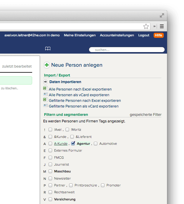 Der Wunsch war groß nach einer Erweiterung der Filterfunktion, mit der man auch nach Personen filtern kann, obwohl die relevanten Tags bei den Firmen abgelegt sind. Häufig hörten wir, dass Tags sowohl bei Personen als auch bei Firmen vergeben werden, damit man einerseits auf der Firmenebene und andererseits auf der Personenebene (z.B. zum Newsletter Versand) filtern kann.