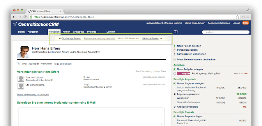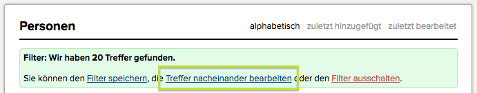 Sobald Sie Ihre Personen im CRM gefiltert haben, zeigen wir Ihnen ab sofort die Möglichkeit die Treffer nacheinander zu bearbeiten.