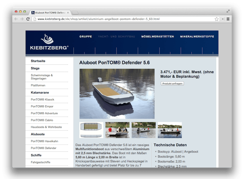 Auf den Seiten stellt Kiebitzberg® die verschiedenen Produkte vor - jedes Produkt hat so eine eigene Seite mit Informationen, Illustrationen und teilweise Preisinformationen. Die Palette reicht von Booten über verschiedene Handelswaren bis hin zum Küchenstudio.