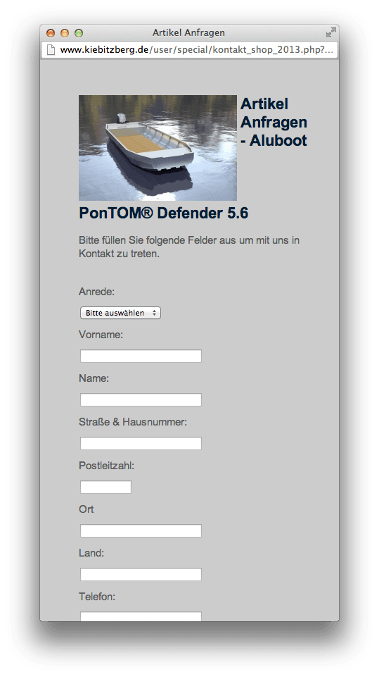 Auf der Seite zum Produkt kann der Besucher direkt eine Anfrage starten. Es öffnet sich eine Maske mit einer Reihe von Informationen, die gesammelt werden sollen.