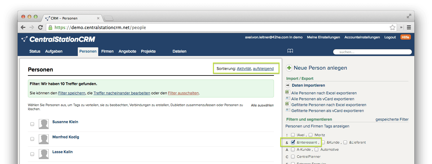 Natürlich funktioniert die neue Sortierung auch in Kombination mit den Filtern - Sie können nun also zum Beispiel nach allen Personen mit dem Tag Interessent filtern und diese dann nach der Aktivität sortieren lassen.
