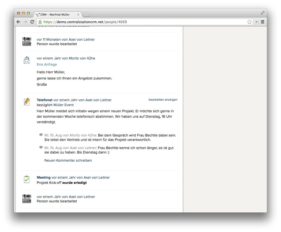 Die Grundlage des Updates bildet eine komplette Neugestaltung des Verlaufs innerhalb von CentralStationCRM. Der Verlauf ist ein ganz zentrales Element, welches wir auf sehr vielen Seiten innerhalb der CRM Software nutzen, um die Historie möglichst gut darzustellen - es gibt also einen Verlauf zu jeder Person, jeder Firma, jedem Angebot und jedem Projekt. Außerdem gibt es einen Gesamtverlauf auf der Status Seite, wo wir die Aktivität der eigenen Firma zusammenfassen und darstellen.