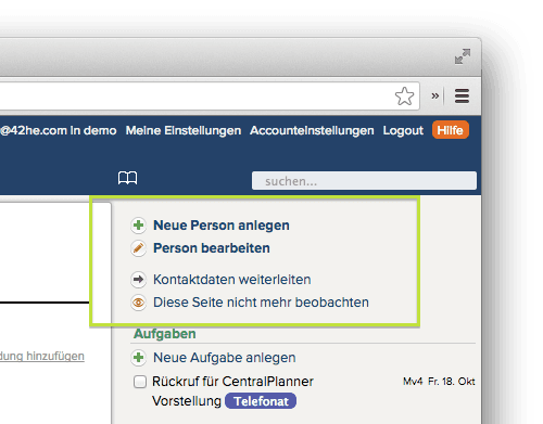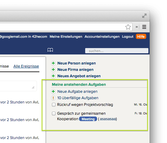 Im Bereich Geschwindigkeit haben wir durch die neuen Verläufe einen neuen Meilenstein gesetzt. Auch wenn die Anzeige einer E-Mail auf der Startseite noch leicht anders aussieht, als auf der Seite der jeweiligen Person - wir nutzen an beiden Stellen exakt den gleichen Inhalt, modifizieren ihn nur leicht. Das ermöglicht uns modernste Caching Technologien über verschiedene Seiten hinweg zu nutzen. Wir gehen sogar noch weiter und machen dies über verschiedene Benutzer eines CRM Systems hinweg. Ein einfaches Beispiel: wenn Ihr Kollege in München gerade auf der Seite eines Kunden war und dabei eine E-Mail und zwei Aufgaben angelegt hat und Sie sich ein paar Stunden später an Ihrem Rechner in Hamburg im CRM einloggen, dann wird Ihr Seitenaufruf nach dem Login schneller gehen.