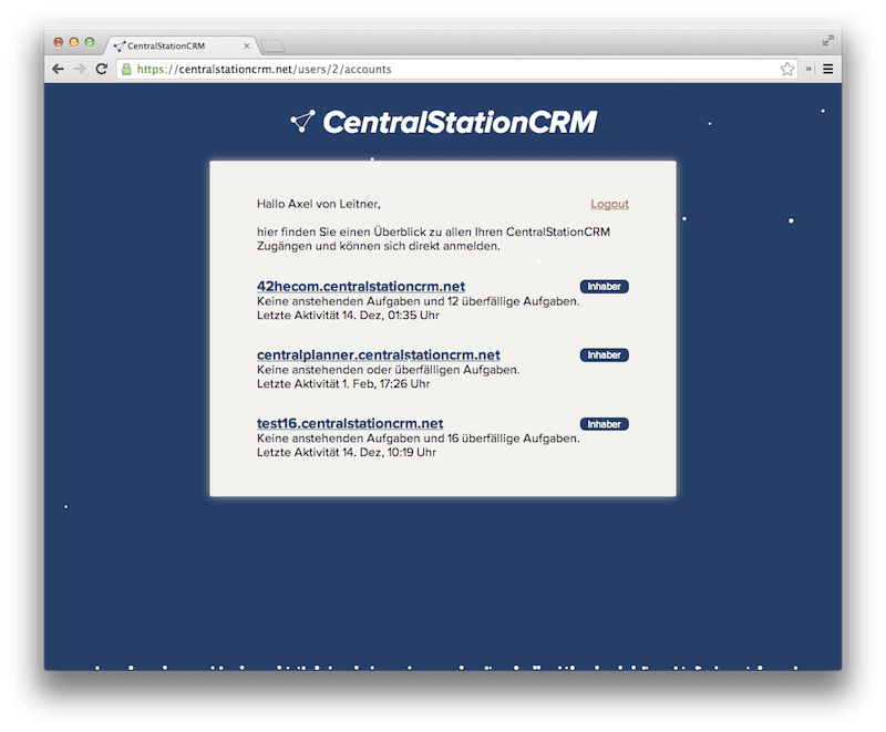 Ihr könnt Euch in Zukunft einloggen, ohne über Eure CRM-Adresse zu gehen (vorher: https://accountname.centralstationcrm.net)