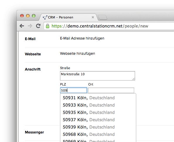 Das “Person anlegen” und das “Firma anlegen” Formular wurde komplett überarbeitet. Die Reihenfolge der Felder haben wir dem Nutzerverhalten angepasst und deutlich schlanker gestaltet. Auch die Nutzung der Tabulator-Taste zum springen von Feld zu Feld geht jetzt schneller und intelligenter von der Hand. Nach der Eingabe der Postleitzahl ergänzen wir Stadt und Land zeitsparend ganz automatisch. Dies gilt für Postleitzahlen aus Deutschland, Österreich und der Schweiz.