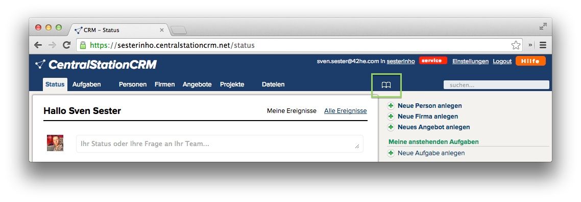 Sie haben in CentralStationCRM vor einer Stunde eine Notiz angelegt und wollen jetzt noch etwas nachtragen? Wenn Sie noch genau wissen wo das war, können Sie natürlich gleich auf die Seite der Person gehen. Wenn nicht, hilft Ihnen vielleicht ein Blick auf Ihren Verlauf. Sprich, eine Liste all der Seiten, die Sie zuletzt in CentralStationCRM aufgerufen haben. Dafür gibt es links neben dem Suchfeld ein kleines Icon in Form eines aufgeklappten Buches.