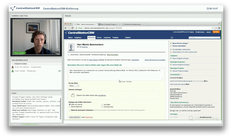 Das Einsteiger Webinar richtet sich dabei an Neulinge, die noch nie mit CentralStationCRM oder einer anderen CRM Software gearbeitet haben. In 45 Minuten zeigen wir Ihnen, wie Sie Kontakte in CentralStation anlegen und organisieren können. Außerdem werden Sie sehen, wie einfach Sie Notizen schreiben oder E-Mails vollautomatisch im CRM System ablegen lassen. Den dritten Teil des Webinars bilden die Aufgaben, welche Sie als Wiedervorlage und zur Organisation Ihres Arbeitstages nutzen können.