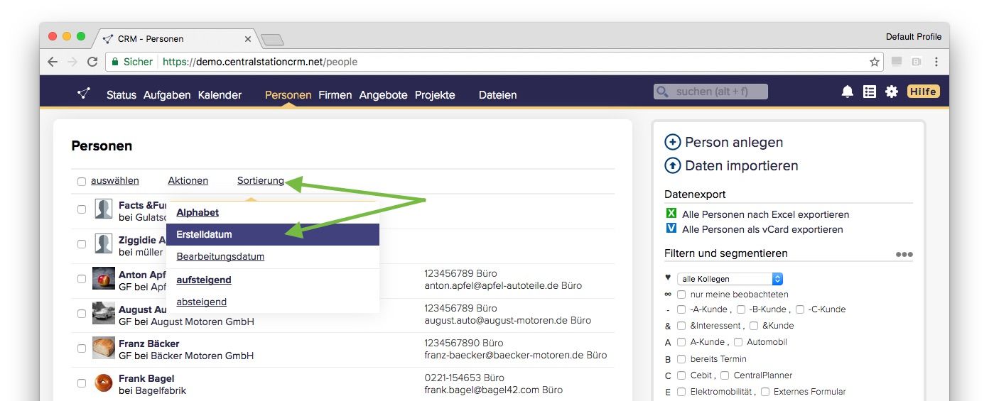 Sowohl bei Personen als auch bei Firmen haben Sie die Möglichkeit die Sortier-Funktion zu nutzen. Wenn Sie die Kontakte nach “Bearbeitungsdatum” - “aufsteigend” sortieren, werden Ihnen zuerst die Kontakte angezeigt, die Sie am längsten nicht mehr oder noch nie bearbeitet haben. Als Bearbeitung wird jede Notiz, Aufgabe oder die tatsächliche Bearbeitung der Person, also zum Beispiel das Ändern des Namen oder Hinzufügen einer Telefonnummer gesehen. Wenn Sie also Personen oder Firmen haben, bei denen noch nie etwas passiert ist, dann werden Sie diese schnell mit der Sortierung nach aufsteigendem Bearbeitungsdatum finden.