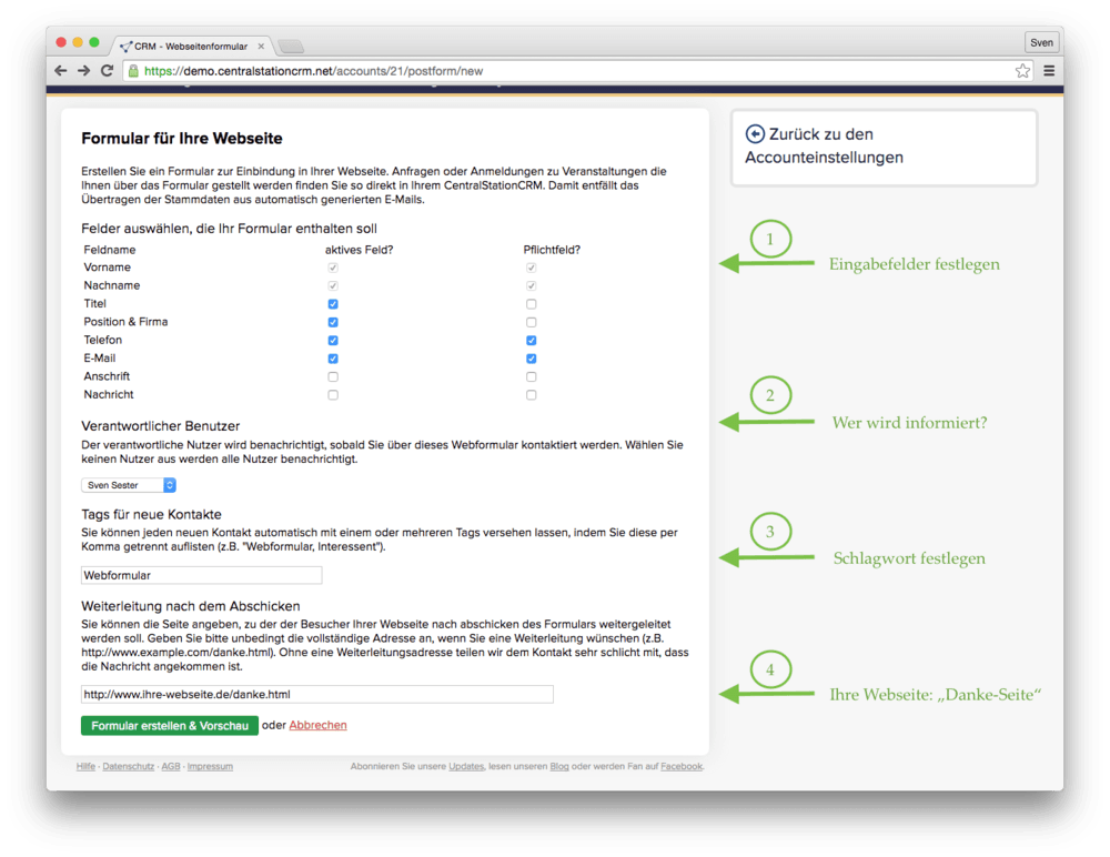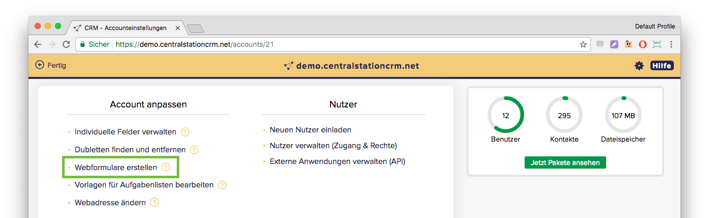 Um ein solches Formular zu nutzen, gehen Sie in CentralStationCRM zunächst in die Accounteinstellungen und klicken dort auf “Webformulare erstellen”.