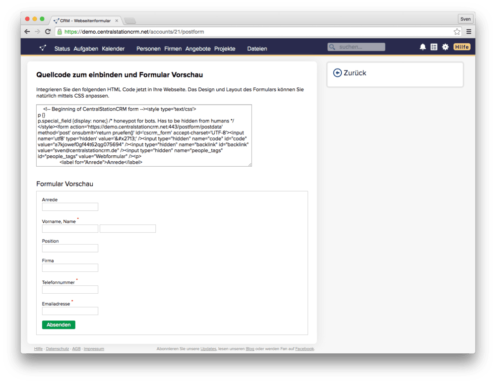 CentralStationCRM stellt die Möglichkeit bereit, ein Formular im CRM-System zu erstellen, das Sie mit einem html Code in Ihre Website integrieren können. Alle Daten, die dann in das Kontaktformular auf Ihrer Webseite eingetragen werden, landen direkt in CentralStationCRM. Sie werden vom CRM-System darüber benachrichtigt, so dass Sie keinen neuen Eintrag verpassen. Außerdem werden alle Kontakte, die Sie über das Formular auf Ihre Webseite generieren, mit einem entsprechenden “Tag” / Schlagwort versehen.