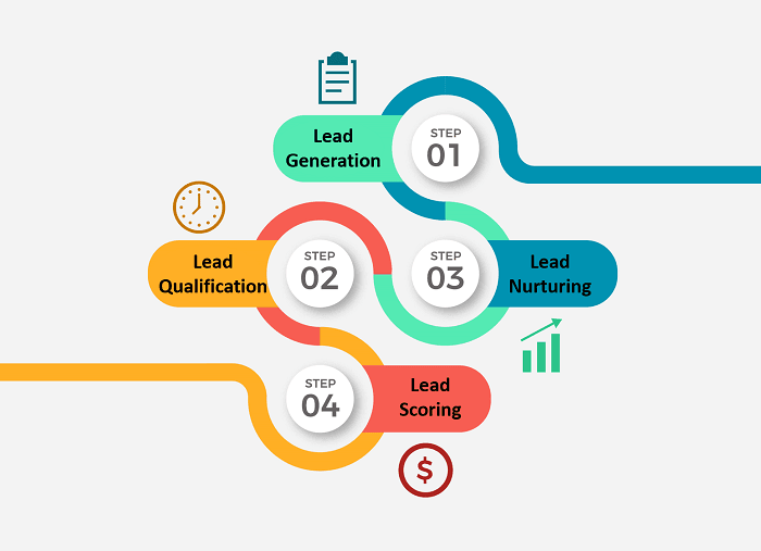 Mit dem richtigen Ansatz lohnt sich aber auch hier ein Lead Management. Denn gerade KMU konzentrieren sich häufig zu sehr auf die Gewinnung neuer Leads, vergessen im Anschluss aber, dass die gewonnenen Kontakte nur selten ohne Mithilfe zu Kunden konvertieren. In KMU bietet sich für das Lead Management ein vierstufiger Prozess an:
