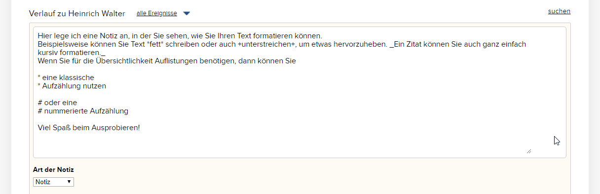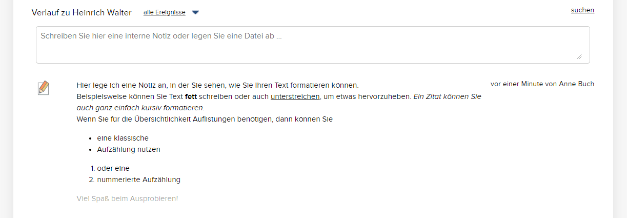 Wir haben uns ganz bewusst dazu entschieden, den Funktionsumfang von CentralStationCRM auf die Dinge zu beschränken, die im Arbeitsalltag von kleinen und mittelständischen Unternehmen wirklich wichtig sind. Denn je mehr Funktionen ein System enthält, desto komplexer und unübersichtlicher wird es und dies führt schnell dazu, dass es gar nicht mehr genutzt wird. Aus diesem Grund beschränken wir uns auch bei den Notizen auf das, was wirklich wichtig ist: Nämlich den Inhalt. Wenn Sie eine Notiz bei einer Person oder einer Firma anlegen, werden Ihnen daher nicht zahlreiche Formatierungsoptionen angezeigt, wie Sie es beispielsweise von einem Word-Dokument kennen, sondern nur ein Textfeld, in das Sie die Inhalte eintippen können.