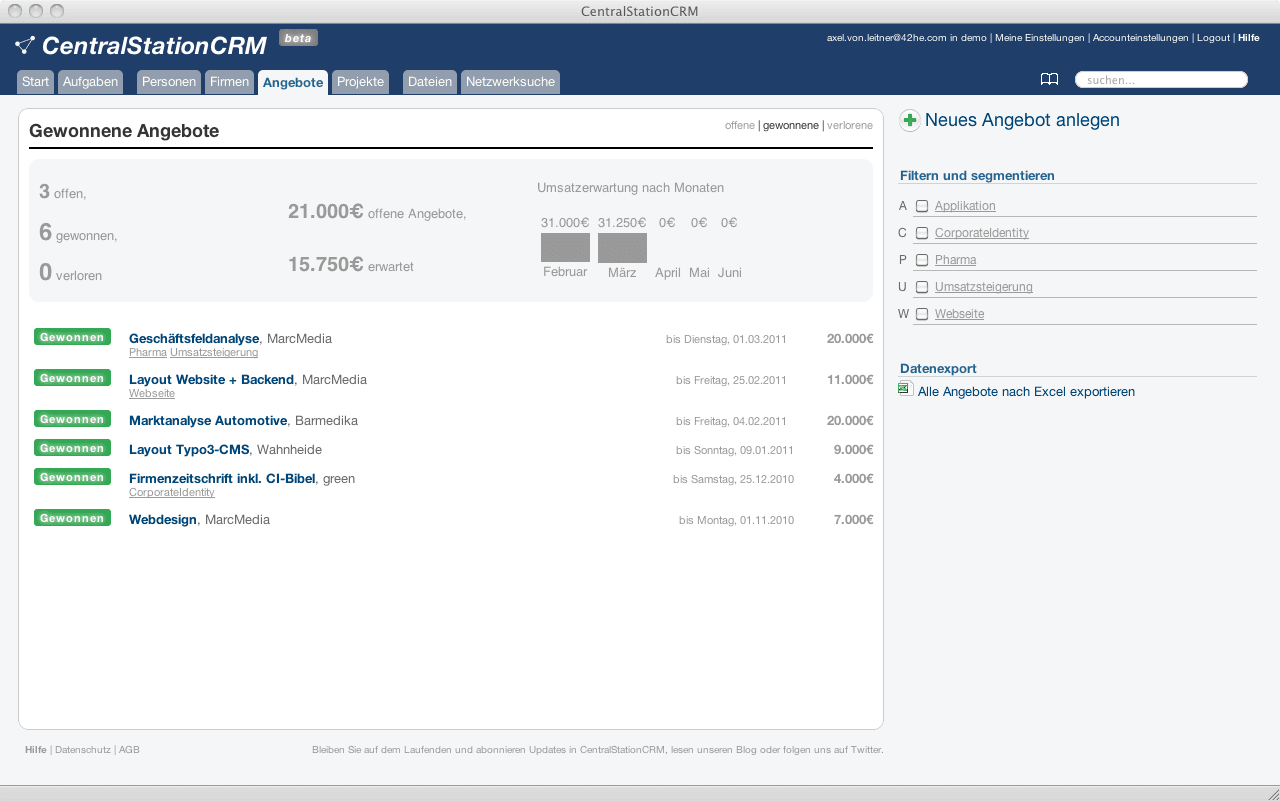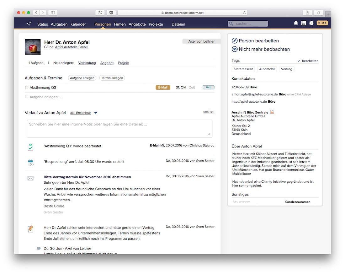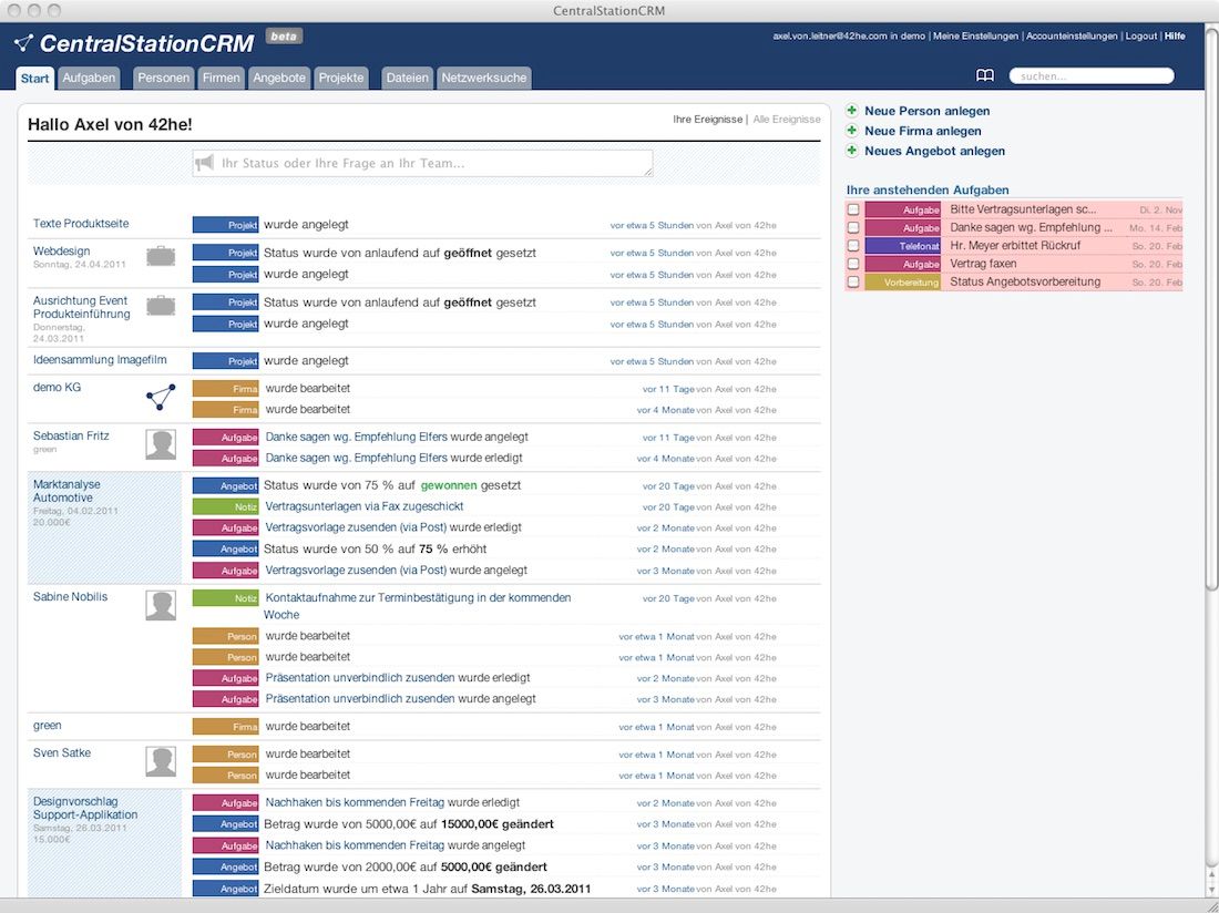 Sie haben die Augen noch offen? Gut so. Damit Sie keine bleibenden Schäden davon tragen, habe ich hier noch einen aktuellen Screenshot von CentralStationCRM. Ich bin gespannt auf unsere Reaktion, wenn wir ihn in 5 Jahren neben die Version von 2021 halten ...