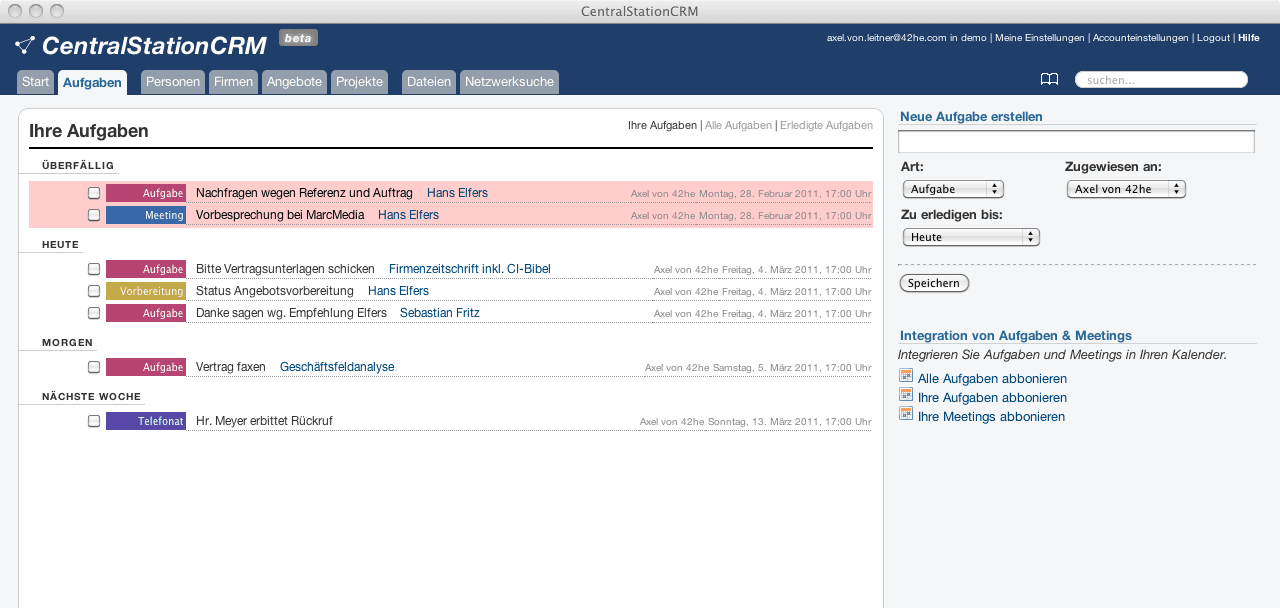 Nächster Reiter: Aufgaben. Damit Sie die überfälligen Dinge nicht übersehen, haben wir sie extra komplett rot gemacht. Ach und übrigens wurde damals jede Aufgabe standardmäßig auf 17 Uhr gesetzt - das Ende des voreingestellten Arbeitstages. Ich weiß nicht, wie oft ich diese Frage im Support beantwortet habe…