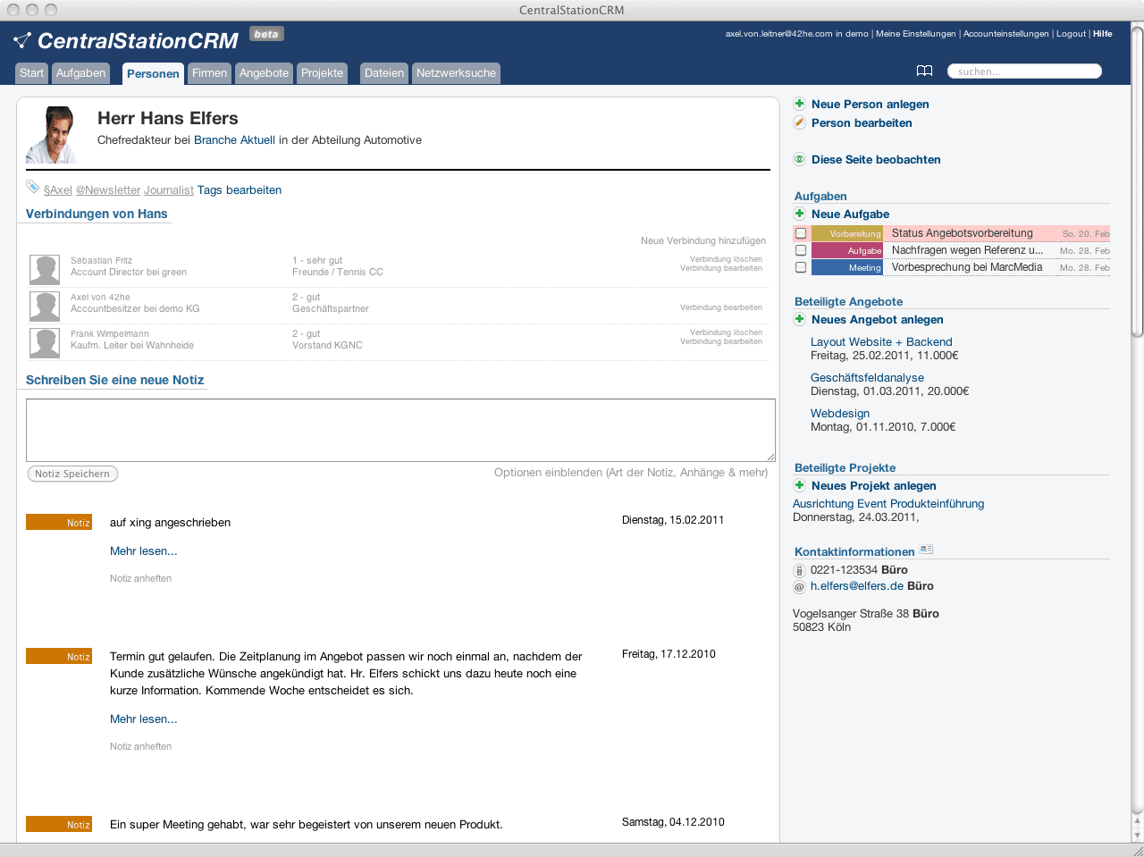 Die Personen gab es natürlich auch schon sehr früh, denn sie sind ja der Kern unserer CRM Software. Wahrscheinlich ist Ihnen schon aufgefallen, dass der Grundaufbau unseres Systems noch immer sehr ähnlich oder nahezu unverändert ist: Navigation oben, links der Bereich für die großen Inhalte und rechts zusätzliche Informationen. Im laufe der Jahre haben wir die Informationen hier sinnvoller angeordnet und teilweise von links nach rechts geschoben. Tags waren zum Beispiel noch relativ lange auf der linken Seite, während die Aufgaben immer sehr wenig Platz in der rechten Spalte hatten.
