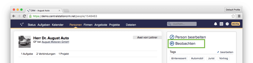Bitte beachten Sie, dass Sie Personen, die importiert und somit automatisch und nicht von Ihnen persönlich angelegt wurden, nicht beobachten. Gleiches gilt für Firmen, die Sie nicht aktiv angelegt haben, sondern die automatisch vom System angelegt wurden, weil Sie eine Person angelegt haben. Wenn Sie diese Personen und Firmen beobachten möchten, müssen Sie dies mit einem Klick aktivieren.