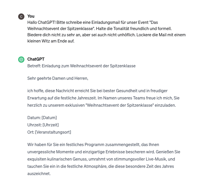 Soll zum Beispiel eine Marketing-Mail innerhalb einer bestimmten Kampagne für eine bestimmte Zielgruppe verfasst werden, müssen Informationen wie Kontext, Unternehmen, Kampagnenziel und Tonalität über den Prompt transportiert werden. Die Resultate werden besser sein, je genauer das System weiß, welcher Nutzen erreicht werden soll.