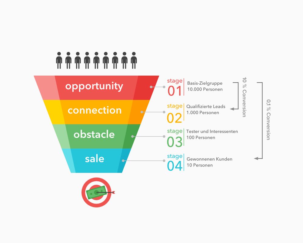Auf den unterschiedlichen Prozessschritten gehen (leider) immer wieder potentielle Käufer verloren, wodurch sich ihre Zahl gut als Trichter (“Sales Funnel”) darstellen lässt. In der Praxis könnte das etwa so aussehen: Ein Autohaus ermittelt seine Zielgruppe in einer Stadt. Diese umfasst alle Haushalte, die noch kein Auto haben oder ein sehr altes, welches sie vermutlich austauschen möchten (10.000 Personen). An diese 10.000 Menschen lässt das Autohaus Werbeprospekte verteilen, um sie auf sein Angebot aufmerksam zu machen. Etwa 10% der Empfänger lesen den Prospekt und kommen in sein Geschäft (1.000). Von diesen 1.000 Besuchern wiederum vereinbaren 10% eine Probefahrt (100) und letztendlich kaufen 10% der Probefahrer ein Auto (10).