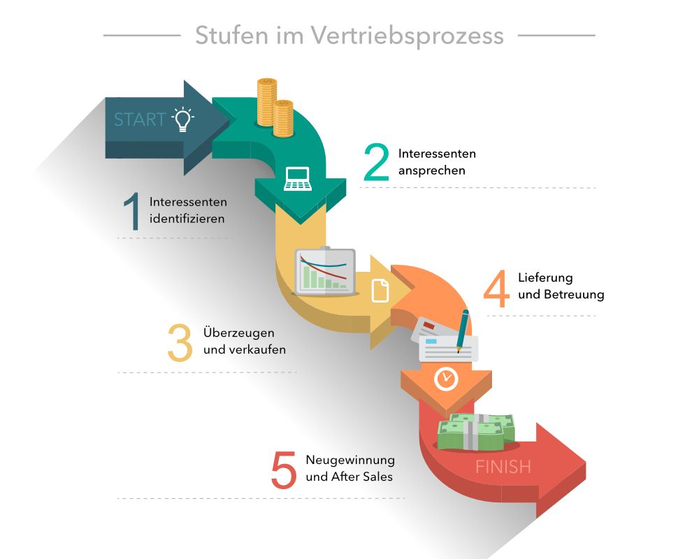 Während man klassisch den Vertriebsprozess quasi linear von Start bis Ende dargestellt hat, geht man heute eher von einem Verkaufszyklus oder “Life Cycle” aus. Der Kunde soll bestenfalls also immer wieder neu gewonnen werden. Der Vertriebsexperte Prof. Winkelmann geht in seinem Buch zur Vertriebskonzeption und -steuerung sogar von mind. acht Schritten aus. Für unser Grundverständnis sollen uns an dieser Stelle jedoch die dargestellten fünf Schritte reichen.