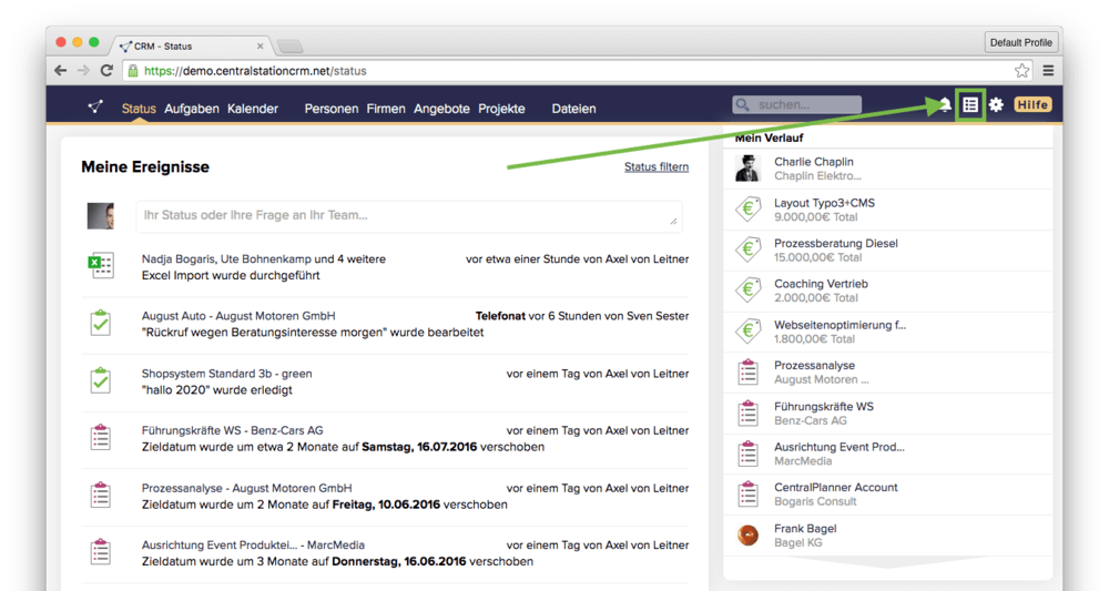 Egal wo Sie sich im CRM befinden: Der Verlauf wird Ihnen immer oben rechts angezeigt.