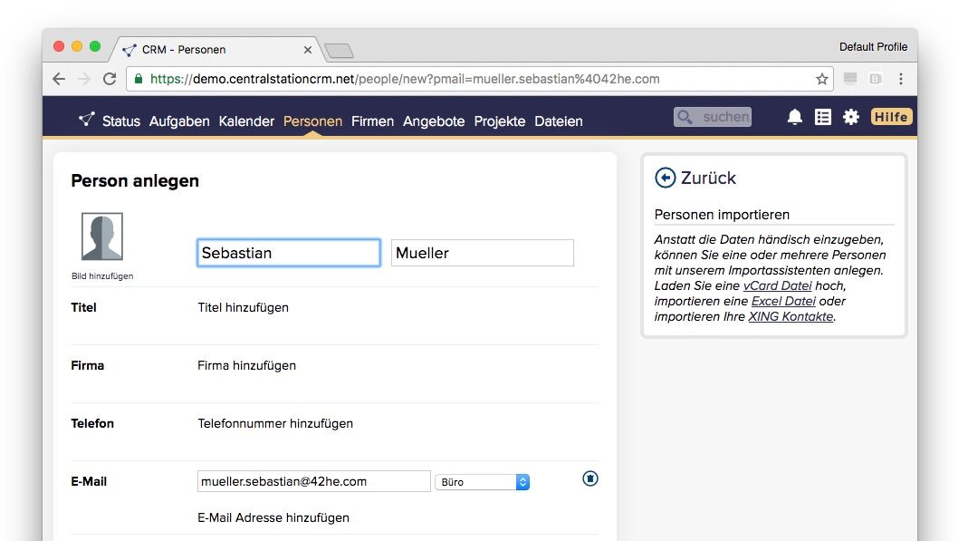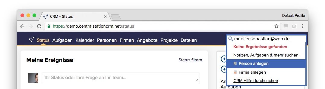 Zunächst nutzen wir diese Logik nur dann, wenn Sie eine E-Mail Adresse in das Suchfeld kopieren, dazu aber noch keine Person angelegt haben. Wie üblich bieten wir Ihnen dann an einen Kontakt mit den gesuchten Daten anzulegen. Hier schaffen wir es jetzt aus mueller.sebastian@ den korrekten Vor- und Nachnamen zu ermitteln, so dass Sie diesen nicht mehr eingeben müssen.