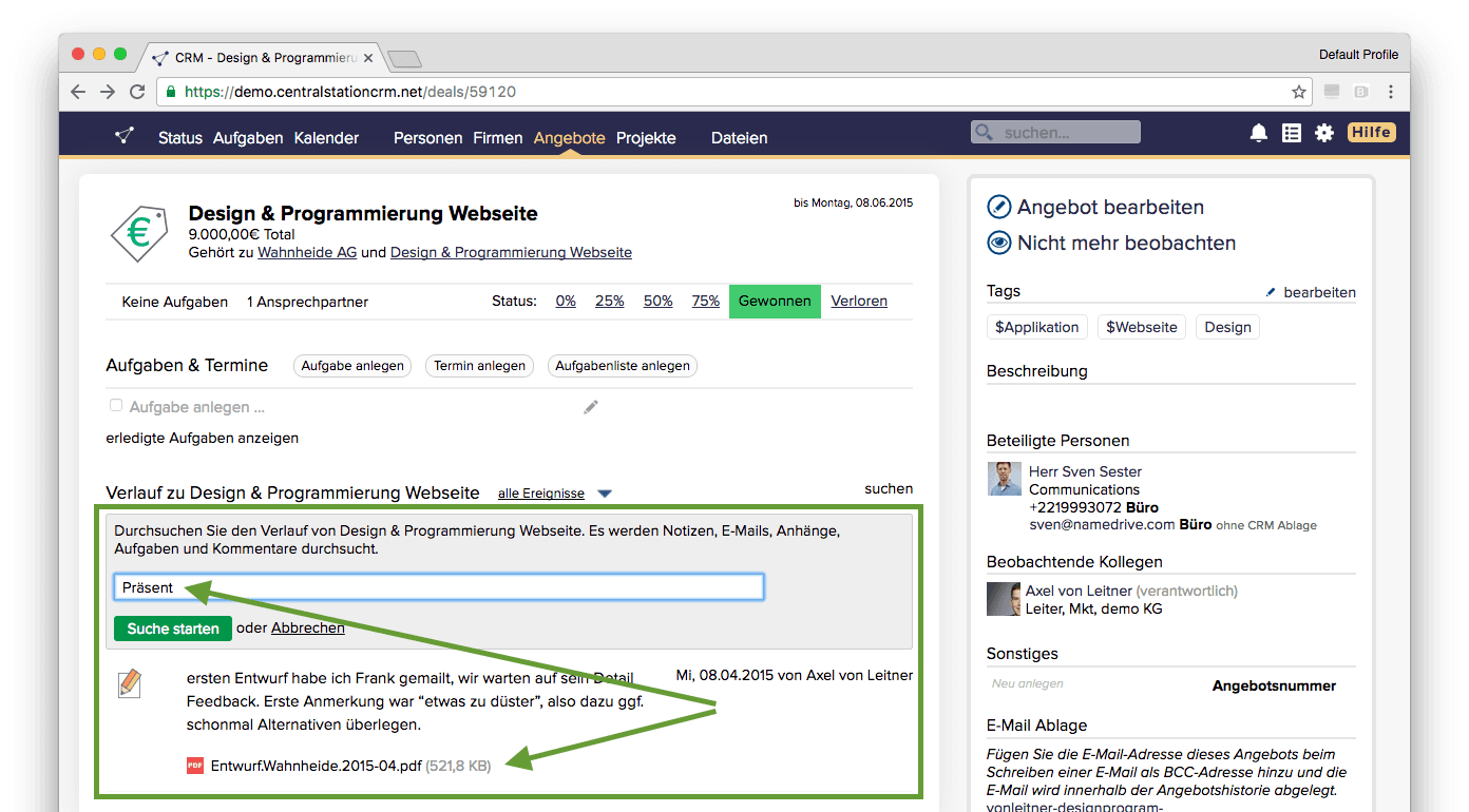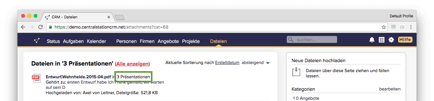 Schon länger können Sie jede Personen, Firmen, Angebots- oder Projektseite durchsuchen, um die E-Mail mit dem Angebot oder zu einem bestimmten Thema zu finden. Auch die Dateinamen durchsuchen wir dort schon immer. Genau diese Suche haben wir jetzt so erweitert, dass auch Ihre Dateikategorien berücksichtigt werden. Wenn Sie also die abgelegten Dateien mit der jeweiligen Kategorie (z.B. Rechnung, Präsentation, Angebot) versehen, dann können Sie so schnell alle Präsentationen zu einem Kunden oder Projekt wiederfinden.