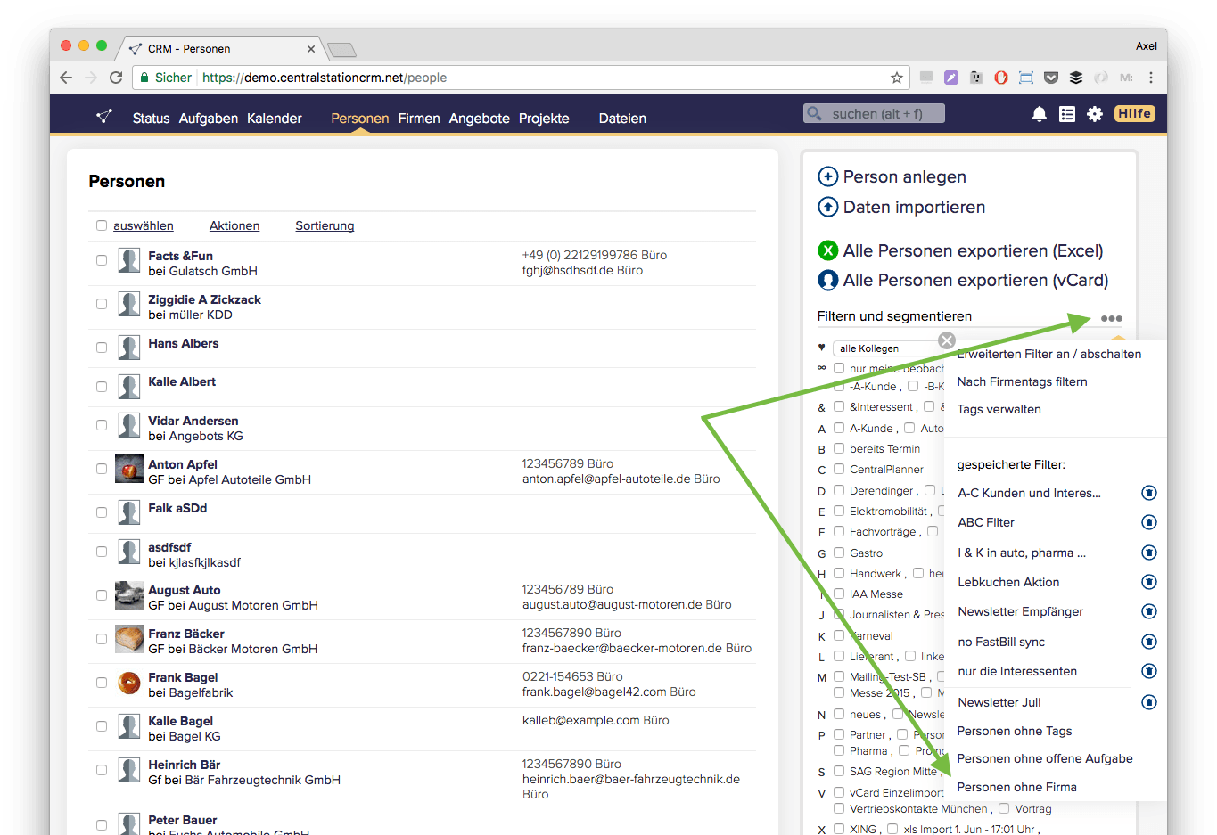 Ob auf der Suche nach vermeintlichen Karteileichen oder der Suche nach neuen Leads, hin und wieder macht es Sinn durch die Personen zu gucken, die keiner Firma (mehr) zugeordnet sind. Vielleicht haben sie gewechselt und sind heute an anderer Stelle tätig. Für diese Art von Suchen haben wir einige Filtermöglichkeiten vordefiniert. Die neue heißt "Personen ohne Firma" und Sie finden Sie über die Übersichtsseite der Personen. In der rechten Spalte auf die drei grauen Punkte geklickt und schon sehen Sie sie am Ende der Filter-Liste.