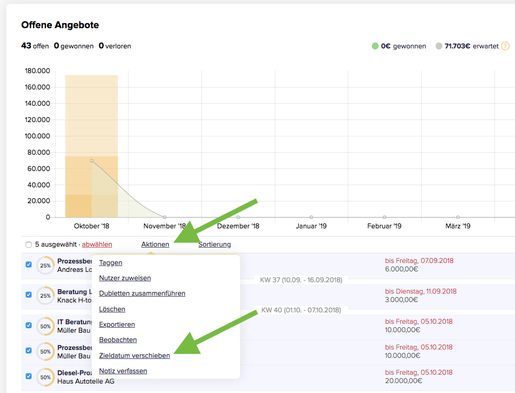 Es kommt vor, dass Angebote und Projekte überfällig werden und damit nicht nach Plan laufen. Das passiert selbst den Besten und ist nicht immer direkt ein Beinbruch. Und wenn das bei mehreren Angeboten oder Projekten passiert, dann ist es umso nerviger, sich durch jedes Angebot oder Projekt einzeln klicken zu müssen, nur um das Datum nach vorne zu setzen.