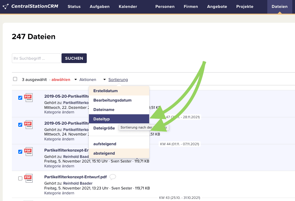 Neben den Sortieroptionen nach Dateiname und Datum gibt es nun zusätzlich die Möglichkeit nach Dateityp und Dateigröße zu filtern. D.h. so lassen sich beispielsweise die in der letzten KW gespeicherten PDF-Dateien anzeigen.
