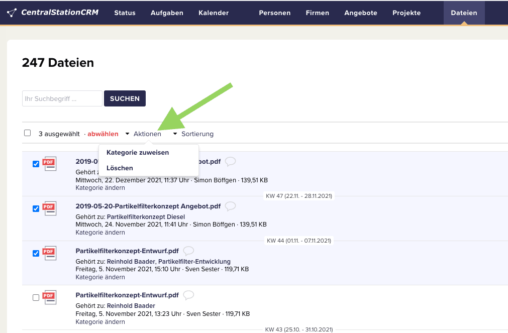 Bisher ließen sich Dateien nur einzeln einer Kategorie zuordnen. Mit diesem Update ist das auch “gebündelt” möglich. D.h. Sie können z.B. 15 Dateien markieren und dann gemeinsam in die Kategorie “Rechnungen” verschieben. Wichtig: Da die Änderung im Hintergrund erfolgt, damit sie direkt weiterarbeiten können, müssen Sie die Seite einmal neu laden, um die neue Zuordnung anzuzeigen.