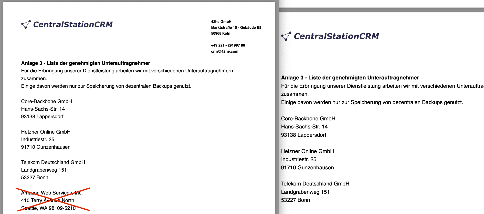 Entsprechend dieser Änderung haben wir unseren Auftragsverarbeitungsvertrag (AVV) angepasst und Amazon aus der Liste der genehmigten Unterauftragnehmer (Anlage 3) entfernt.