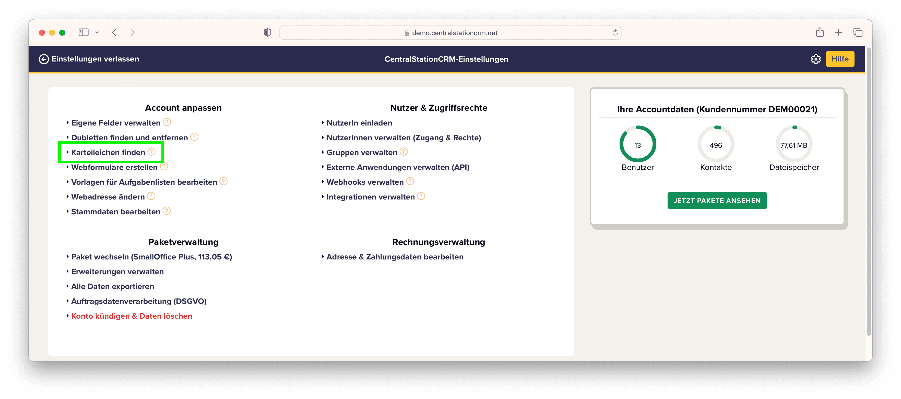 Klicken Sie auf das Zahnrad, dort auf “Accounteinstellungen” und anschließend auf “Karteileichen finden”.