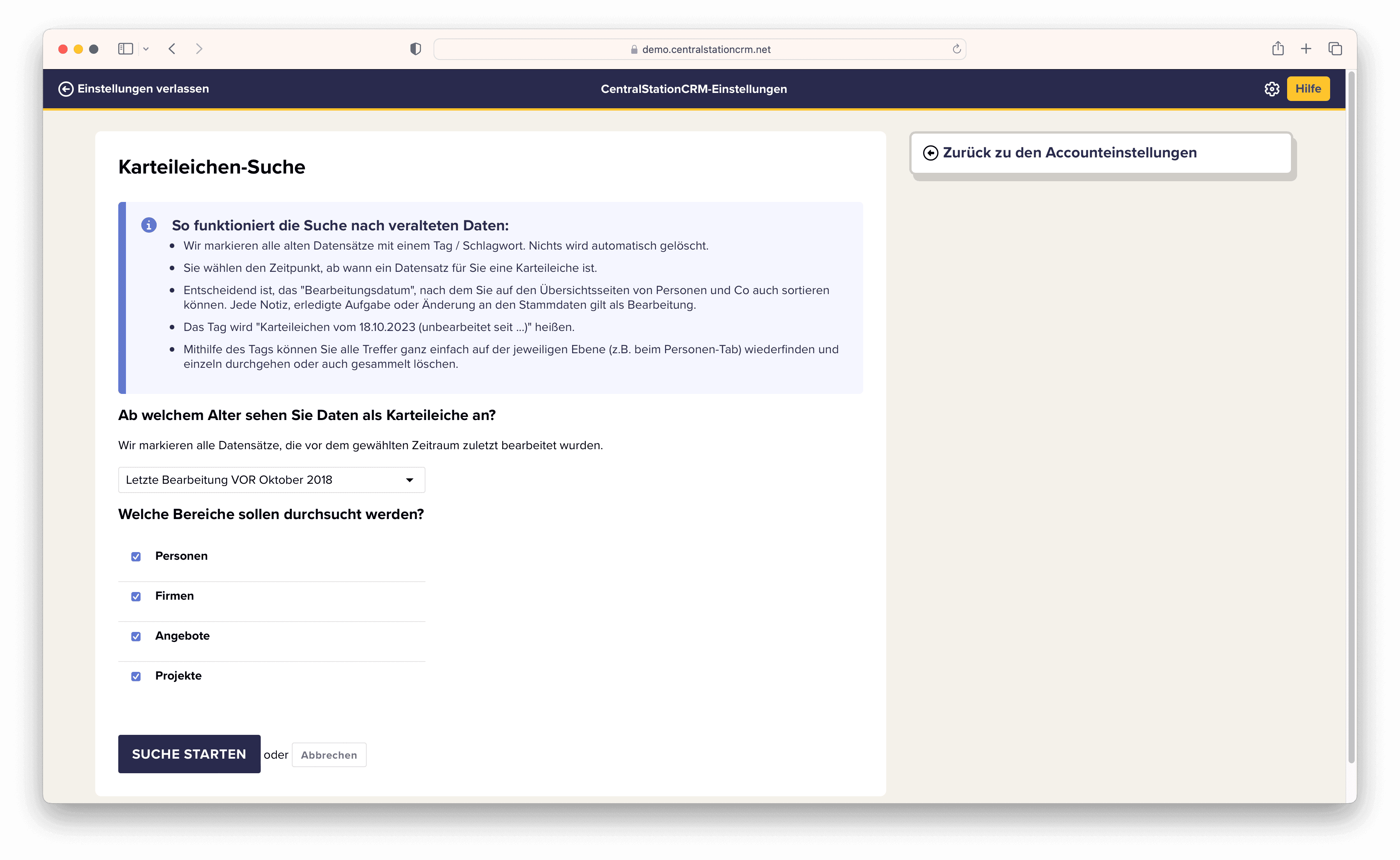Ab sofort können Sie Karteileichen in Ihrer CRM-Software deutlich leichter an den Kragen gehen, denn ein lange ersehntes (und häufig gefragtes) Feature ist ab sofort in den Accounteinstellungen verfügbar: Die Suche nach alten Kontakten (oder Angeboten oder Projekten), also solchen, die seit langer Zeit kein Update mehr erhalten haben und damit entweder “durchgerutscht” sind oder nicht mehr relevant. Auch die DSGVO spielt hier natürlich mit rein, denn Daten von Personen, die vor 10 Jahren mal eine Anfrage gestellt haben, benötigen Sie heute eigentlich gar nicht mehr.