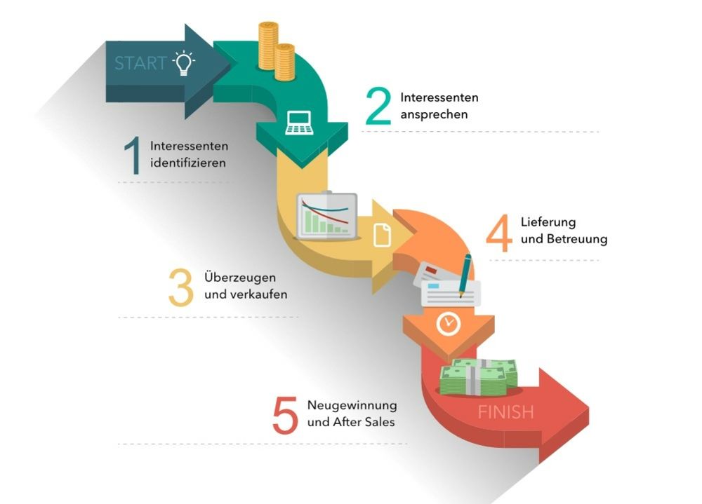 Genug der Vorrede, jetzt geht es ans Eingemachte. Der Vertriebsprozess ist sicherlich abhängig von Produkt und Geschäftsmodell, grob zusammengefasst verläuft er jedoch in diesen fünf Schritten: